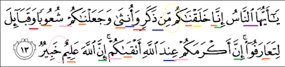 Demikian pembahasan tentang Tajwid Surat Al Hujurat Ayat 13, mudah - mudahan bermanfaat untuk kita semuanya. aamiin.